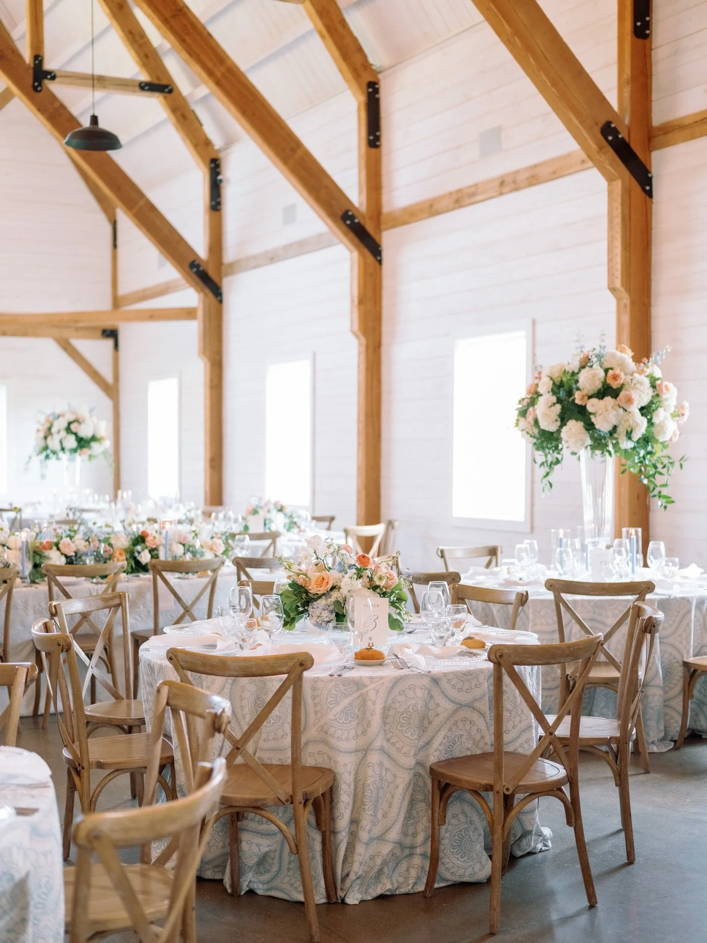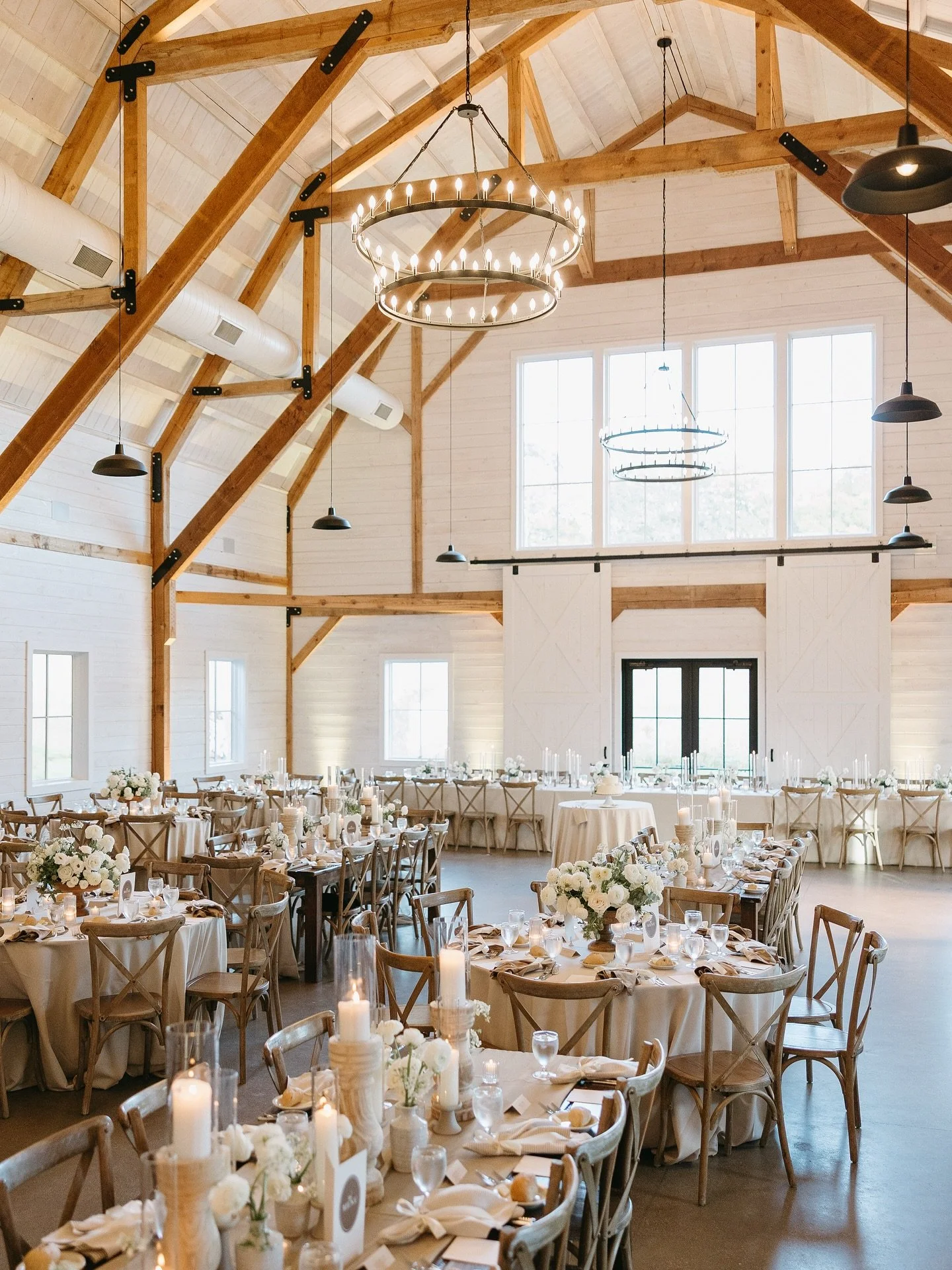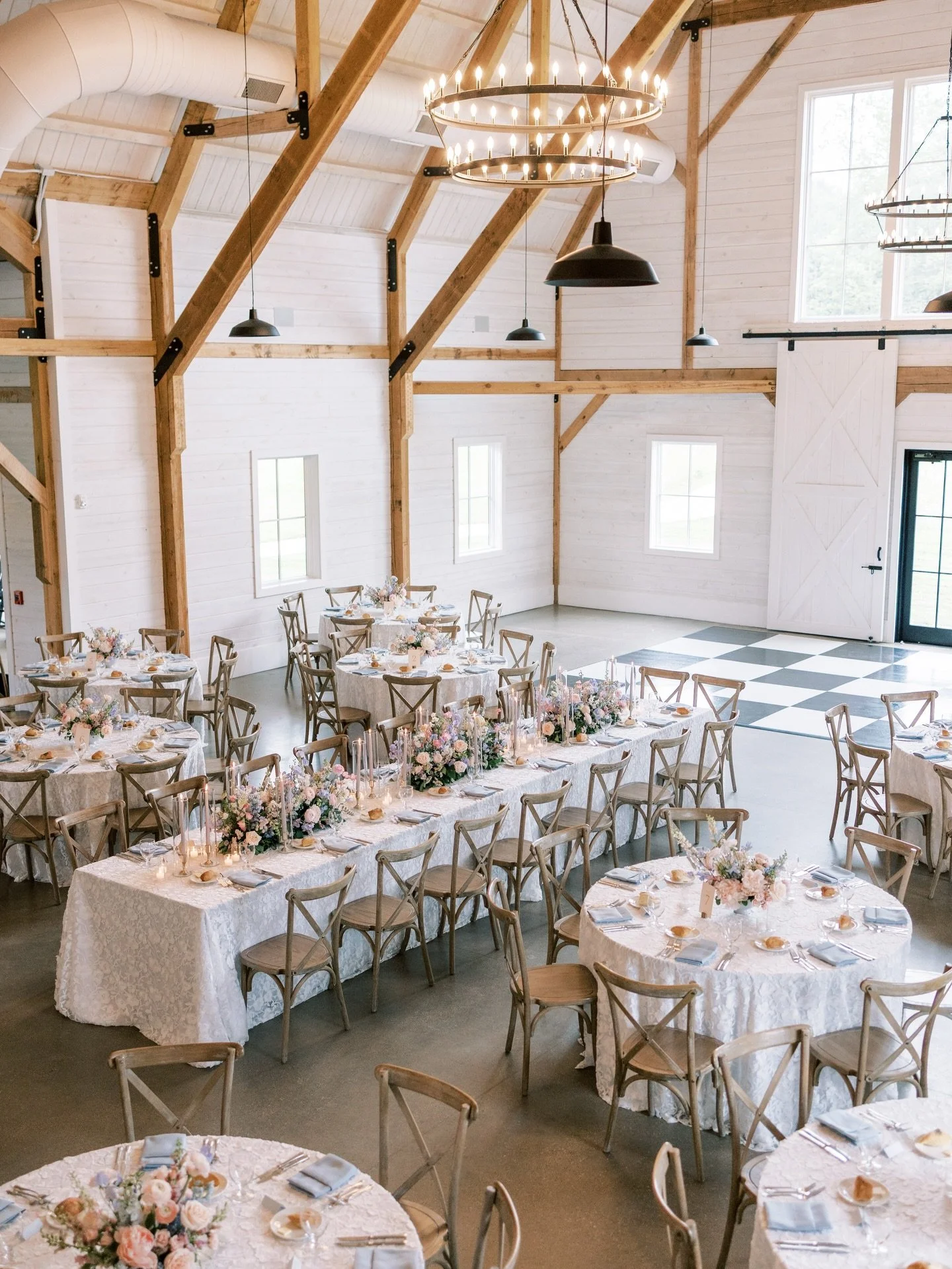 60” round tables comfortably seating 8-10 (Fourteen 8.5’x36” wood farm tables available to rent)